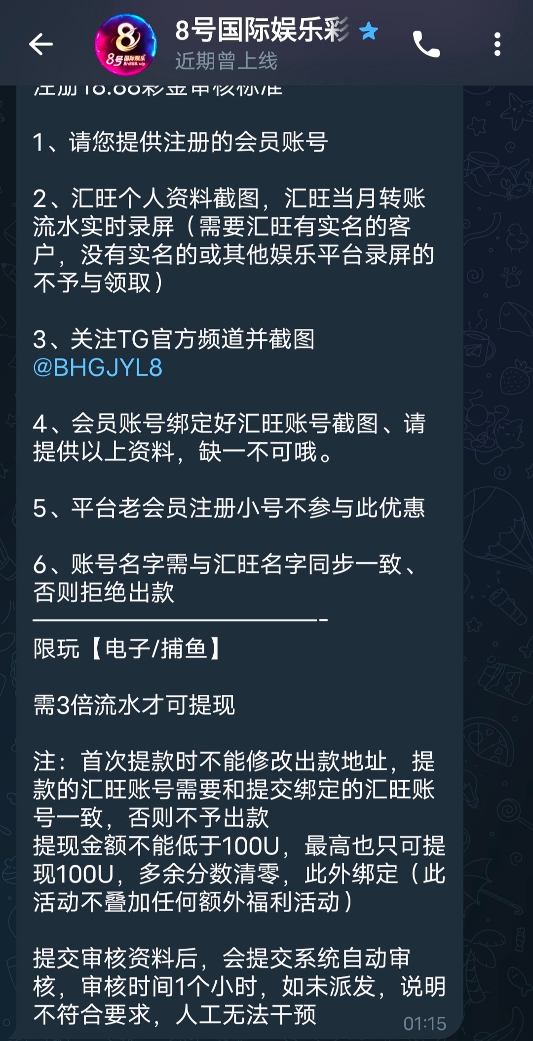 3、关注TG官方频道并截图 @BHGJYL8