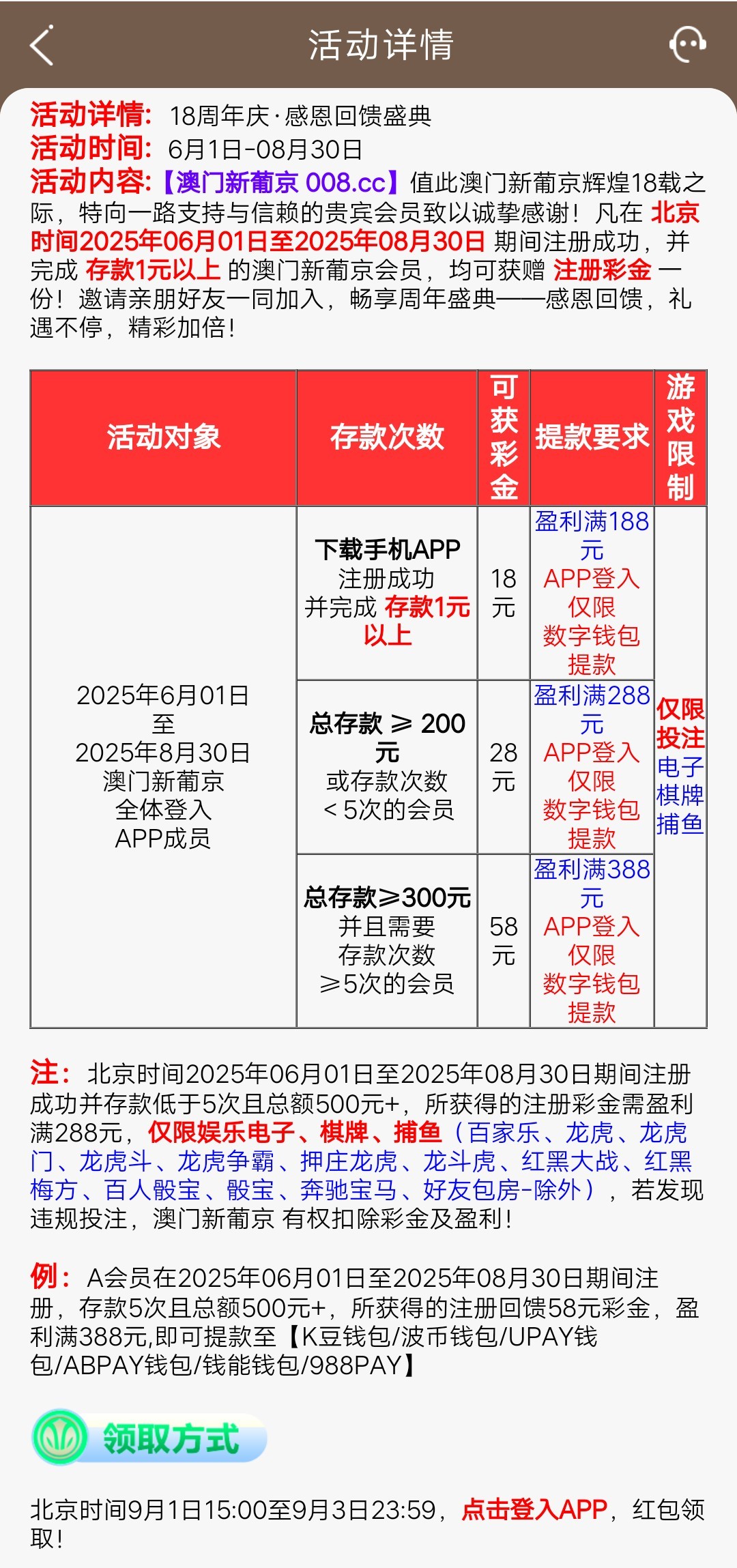 凡在 北京时间2025年06月01日至2025年08月30日 期间注册成功,并完成 存款1元以上 的澳门新葡京会员,均可获赠 注册彩金 一份!